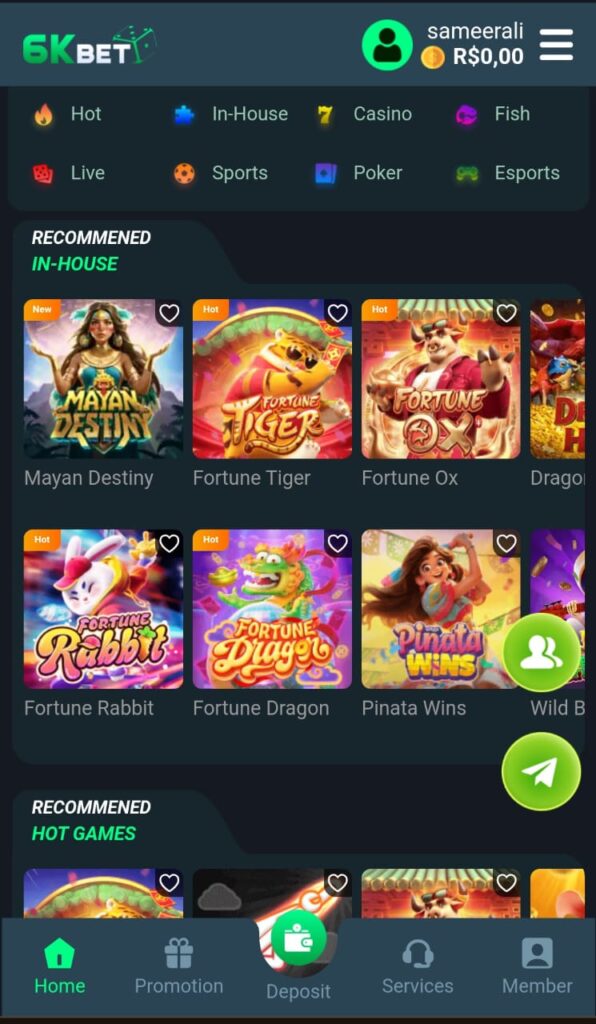 One of the main strengths of the 6KBet app is its large game collection. Players can access slot games, card games, fish shooting games, crash games, prediction games, and sports betting.